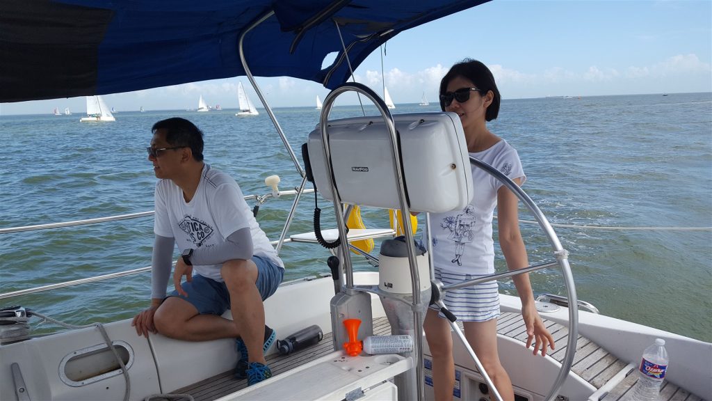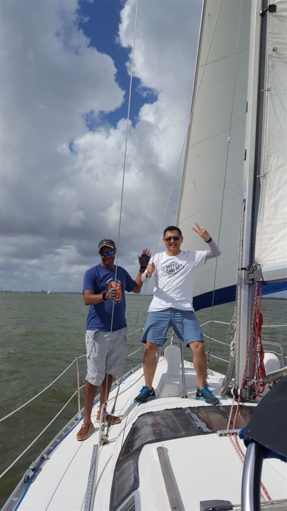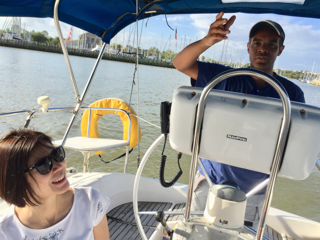 Since it was a calm day with no wind at the dock, casting off was simple and we were under way in no time. The ride out to Galveston Bay was cool, as it gave us a chance to talk about some basics of sailing, and how to navigate in a channel. Once we made it out to the final channel marker, we turned out and raised mainsail first, then the headsail, and we were off!