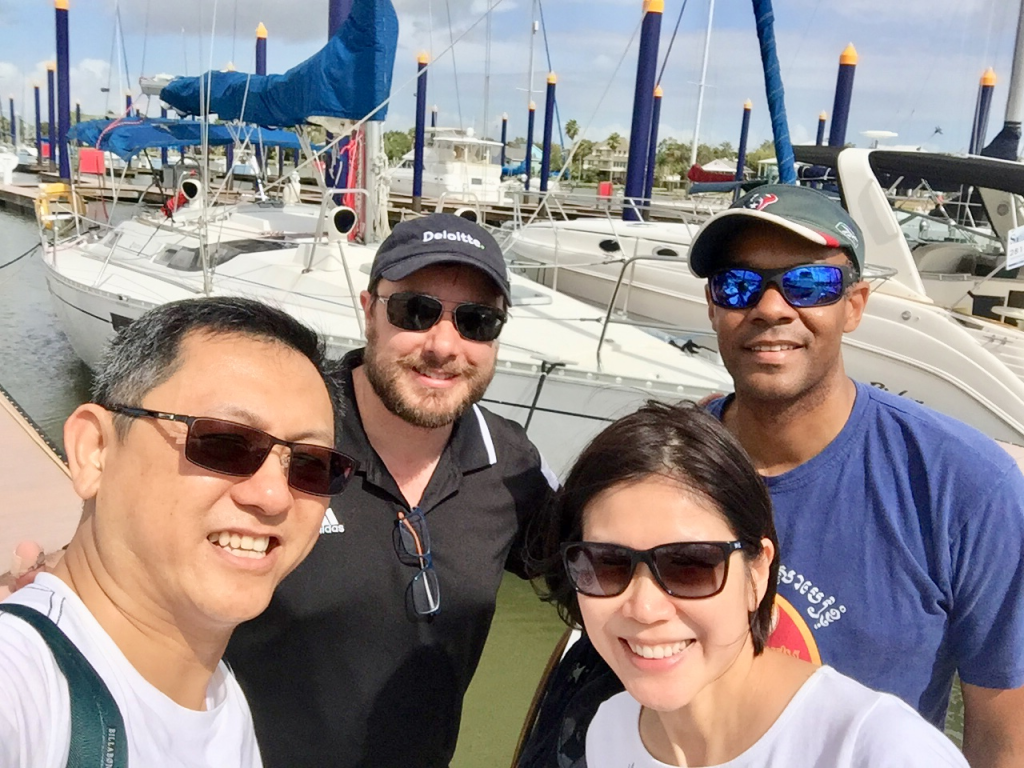 After 10 more minutes of that, it was time to start heading back. Varence took over at the helm to get us closer to the shore. The crew pointed out the direction of the first channel marker and we approached the channel entrance, dropped sails, fired up the motor, then I took over helm duties to maneuver into the channel. By this time the wind had picked up and the sea was much more choppy, and so we rocked and rolled a bit as we motored our way back to the marina. Just before we got into the final stretch, a procession of about 25 speedboats began to intersect our path, and it was a bit hairy to find out way though that. But we managed okay, and before long we were heading back into our boat slip in the marina. I was a bit anxious as I don’t have the best track record for docking, but it went very smoothly and all in all we looked like pros as the boat slid gently into its slip and we tied the boat in.