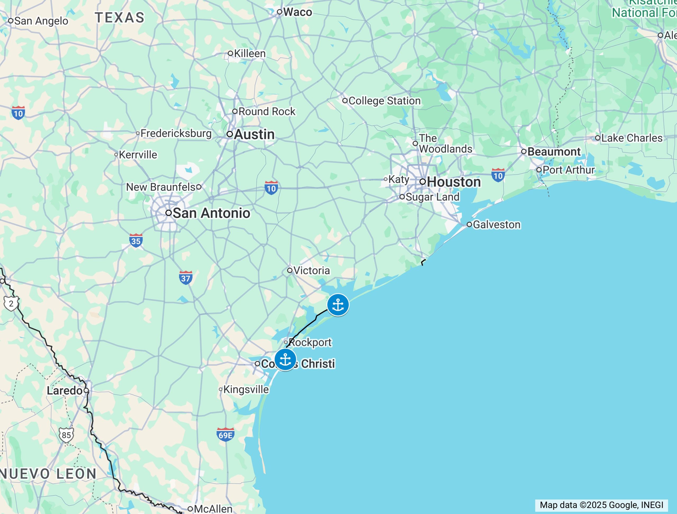 | Location | Port Aransas, Texas USA to an anchorage between PA and Freeport, Texas USA |